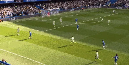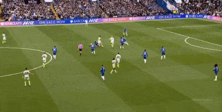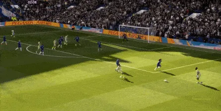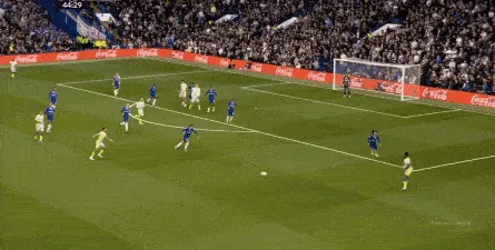 这种情况下,帕尔默和若昂-佩德罗又不能直接从中路打出进攻,也就不能吸引防守重心,从而给边路制造出更大的空间,所以在上半场后半段,切尔西的威胁进攻就变得很少了,这次帕尔默在中路实际失误,但错进错出形成的传中,就是为数不多的机会了: