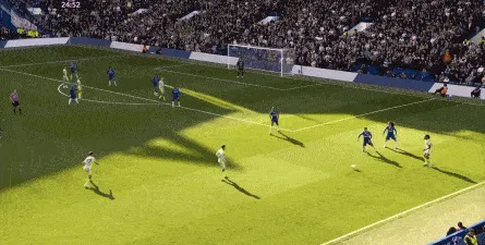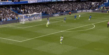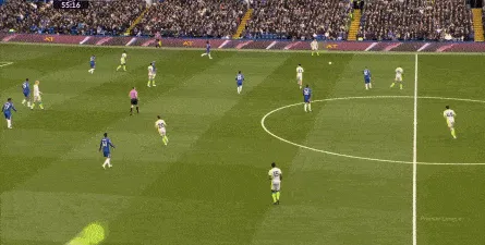 这种情况下,帕尔默和若昂-佩德罗又不能直接从中路打出进攻,也就不能吸引防守重心,从而给边路制造出更大的空间,所以在上半场后半段,切尔西的威胁进攻就变得很少了,这次帕尔默在中路实际失误,但错进错出形成的传中,就是为数不多的机会了: